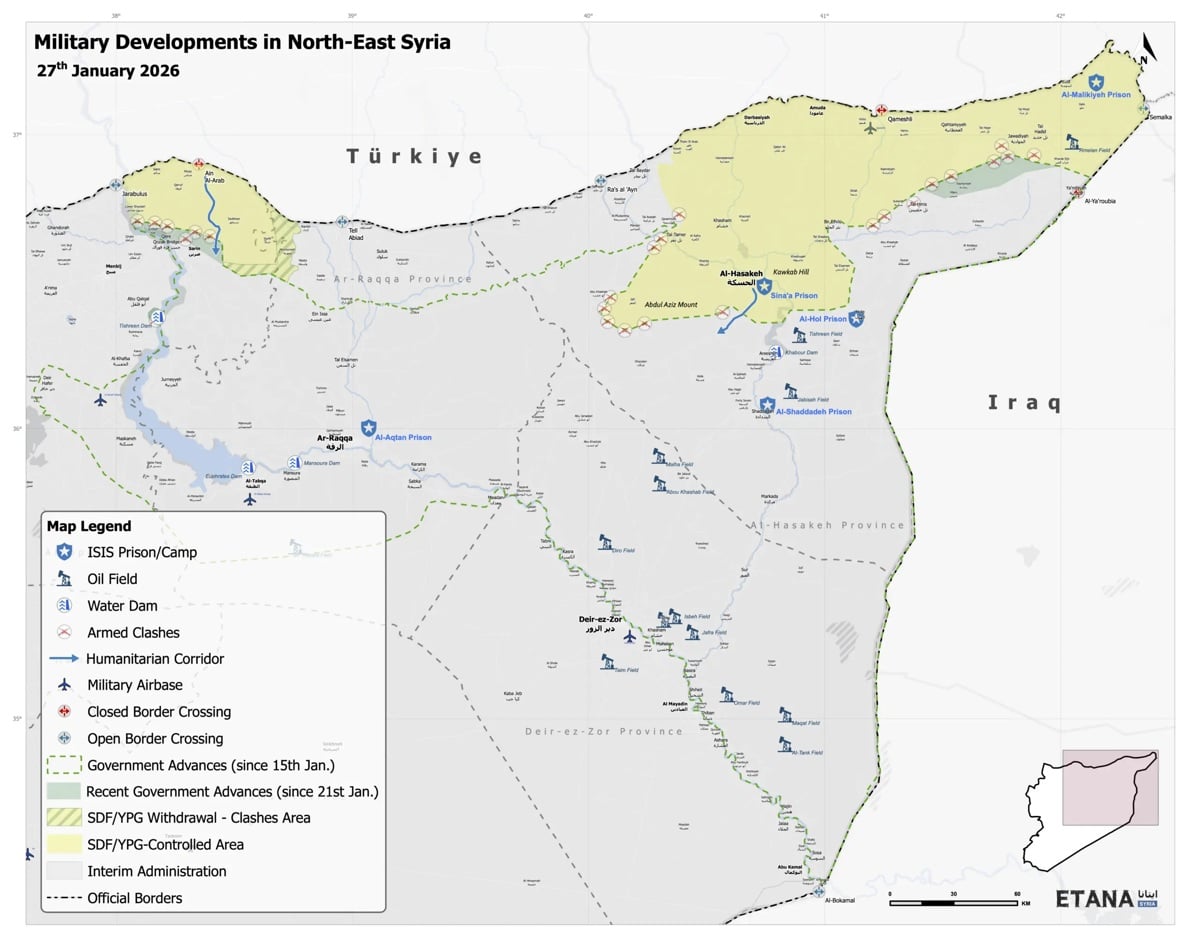 *Kuzeydoğu Suriye’nin 27 Ocak 2026 tarihli haritasını gösteren görsel: Sarı alanlar SDG’nin, gri alanlar ise Suriye Geçici Hükümeti’ne bağlı güçlerin kontrolü altında. (Kaynak: ETANA)
